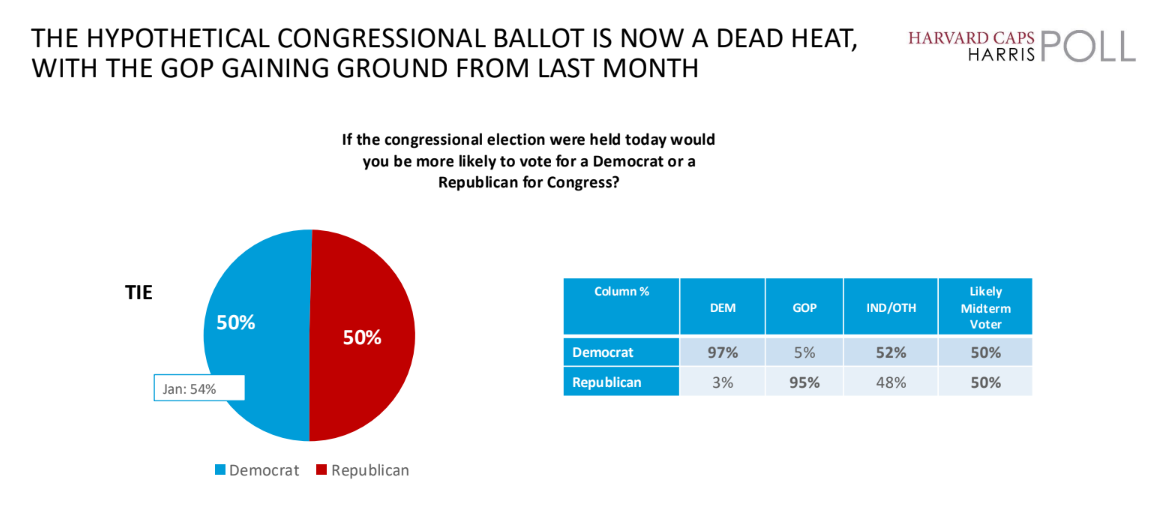 The Generic Congressional Ballot is now essentially tied in the latest Harvard-Harris poll at 50–50 and only slightly favors Democrats in the RealClearPolitics average, even though midterms historically benefit the party not in the White House. That trend is likely to continue, but it appears to be more muted than say their advantage at this moment during Trump’s last Midterm Election in 2018.