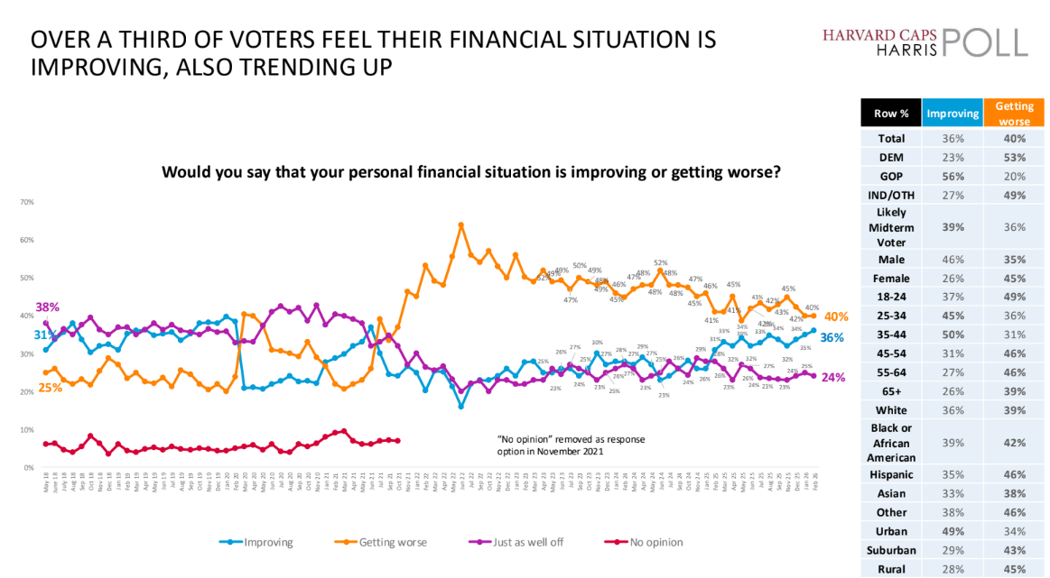 Another important indicator is how voters feel about their own financial situation. Recent polling shows a growing number of Americans saying their personal finances are improving.