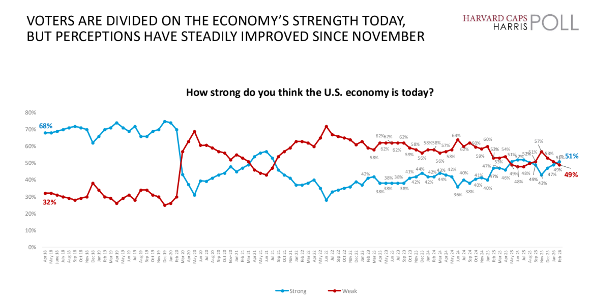 Public sentiment about the economy has been steadily improving since late 2025. In recent polling, 51% of Americans now say the economy is strong.