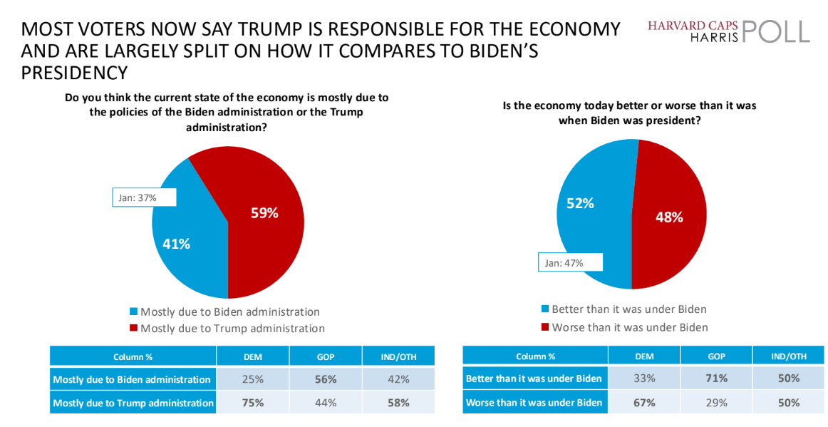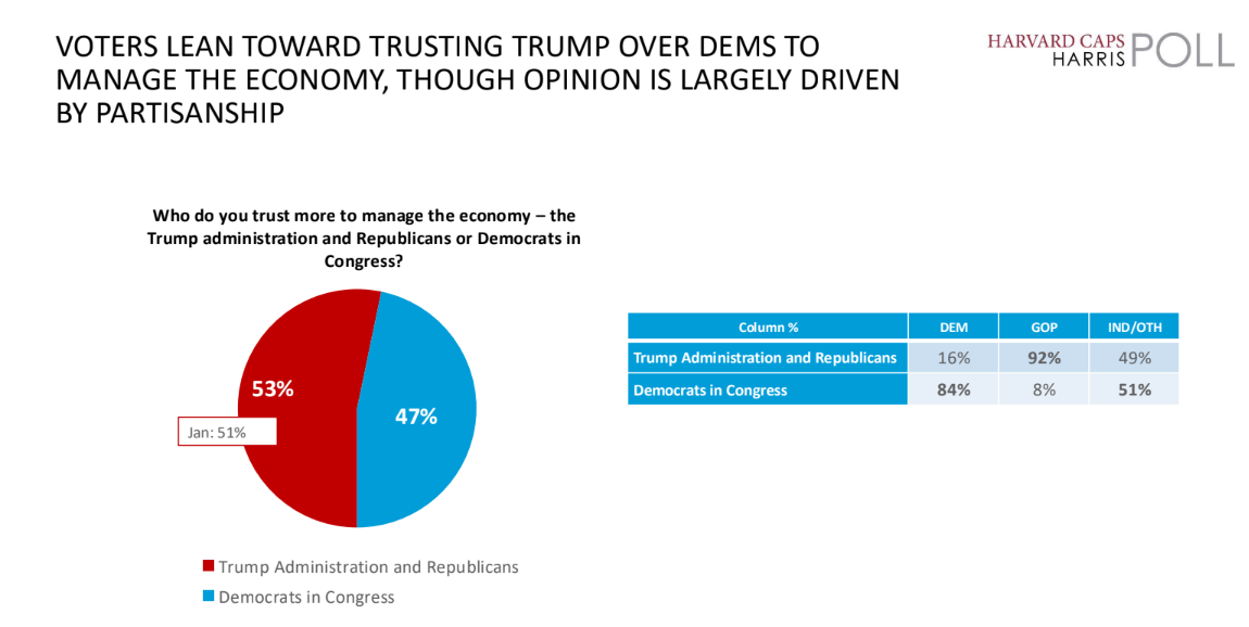 Polling consistently shows that economic trust is a powerful driver of voting behavior. In the latest Harvard-Harris data, voters say they trust Trump and Republicans more than Democrats to handle the economy.